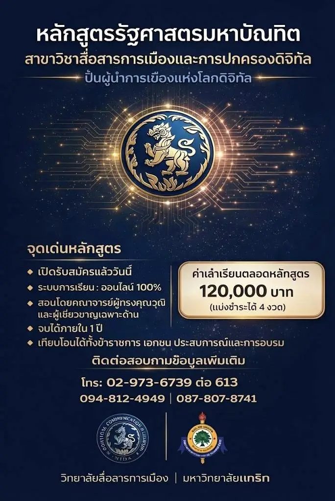 “วิทยาลัยสื่อสารการเมือง หลักสูตรแรกและหลักสูตรเดียวในประเทศไทย ที่จะทำให้ท่านรู้ลึก รู้จริง เรื่องสื่อสารการเมือง บริหารหลักสูตรปริญญาเอกและปริญญาโท”